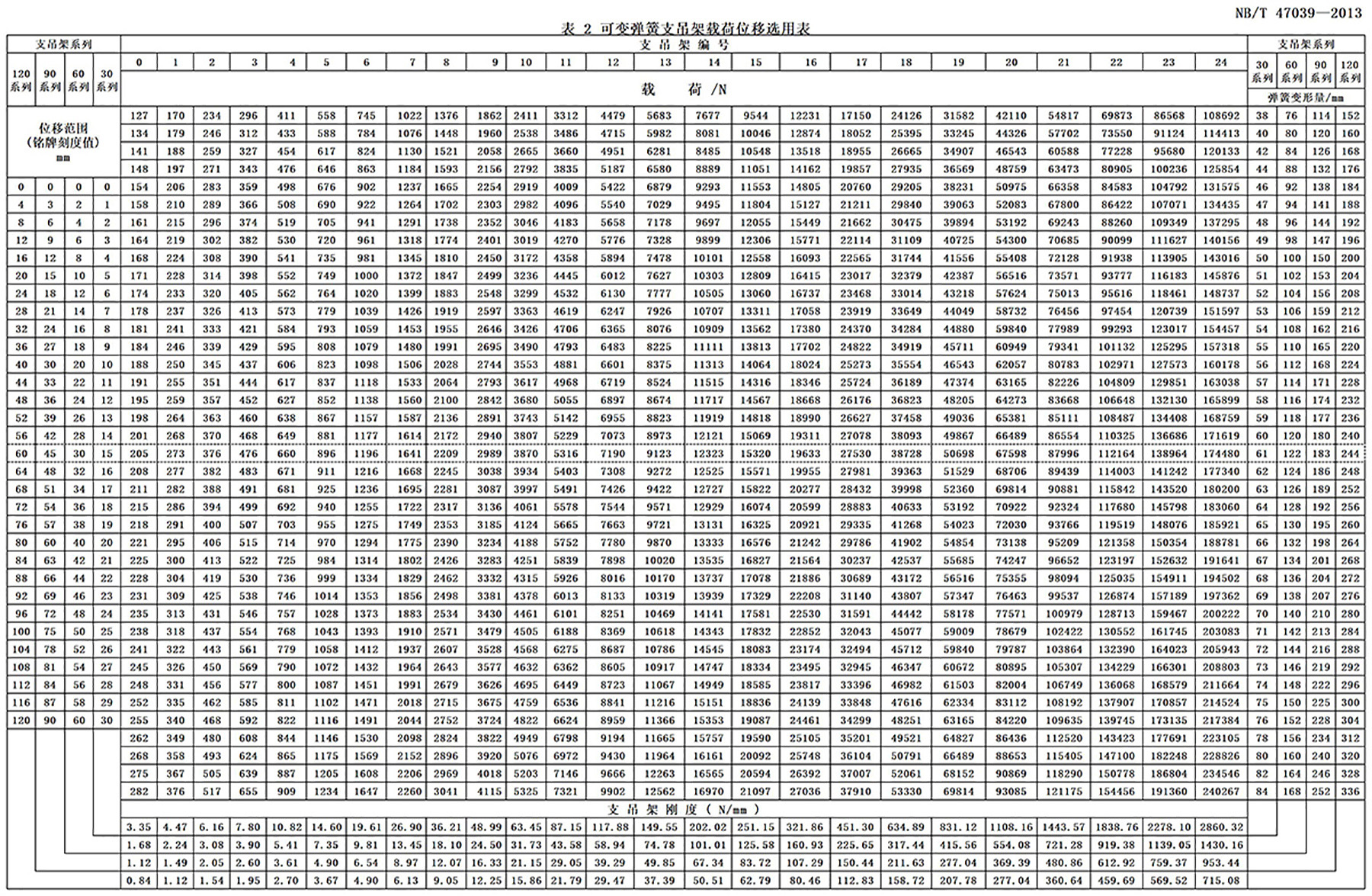 设计者和用户在选用可变弹簧支吊架时,请参考“可变弹簧支吊架载荷位移选用表”(见表2)。该表列出了各型式可变弹簧支吊架编号及其所对应的载荷值、工作位移范围和可变弹簧支吊架弹簧刚度值。