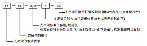 示例:PD38-170(S=70,X=100)-M36表示型式为PD型、编号38号、标准总位移170mm、其中选用标准位移向上70mm,向下100mm、外接吊杆螺纹规格为M36的恒力弹簧支吊架。