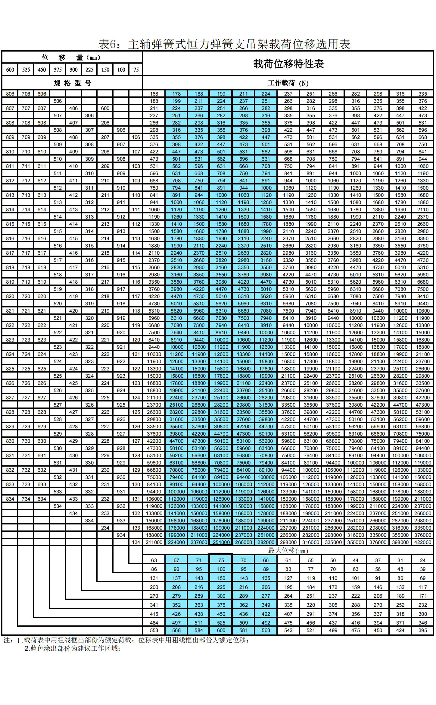 设计者和用户在选用主辅弹簧式恒力弹簧支吊架时,请参考“主辅弹簧式恒力弹簧支吊架载荷位移选用表”(表6)。